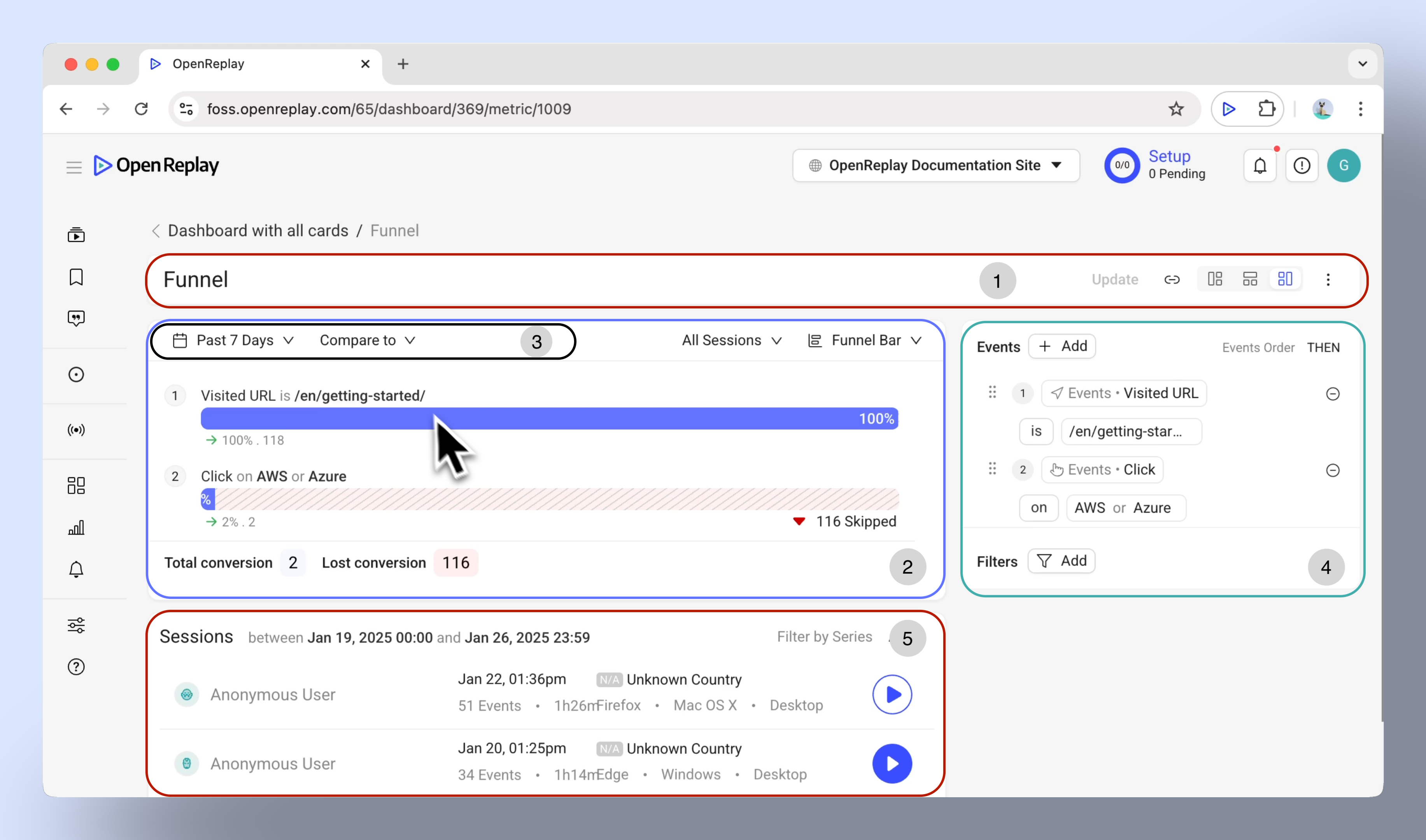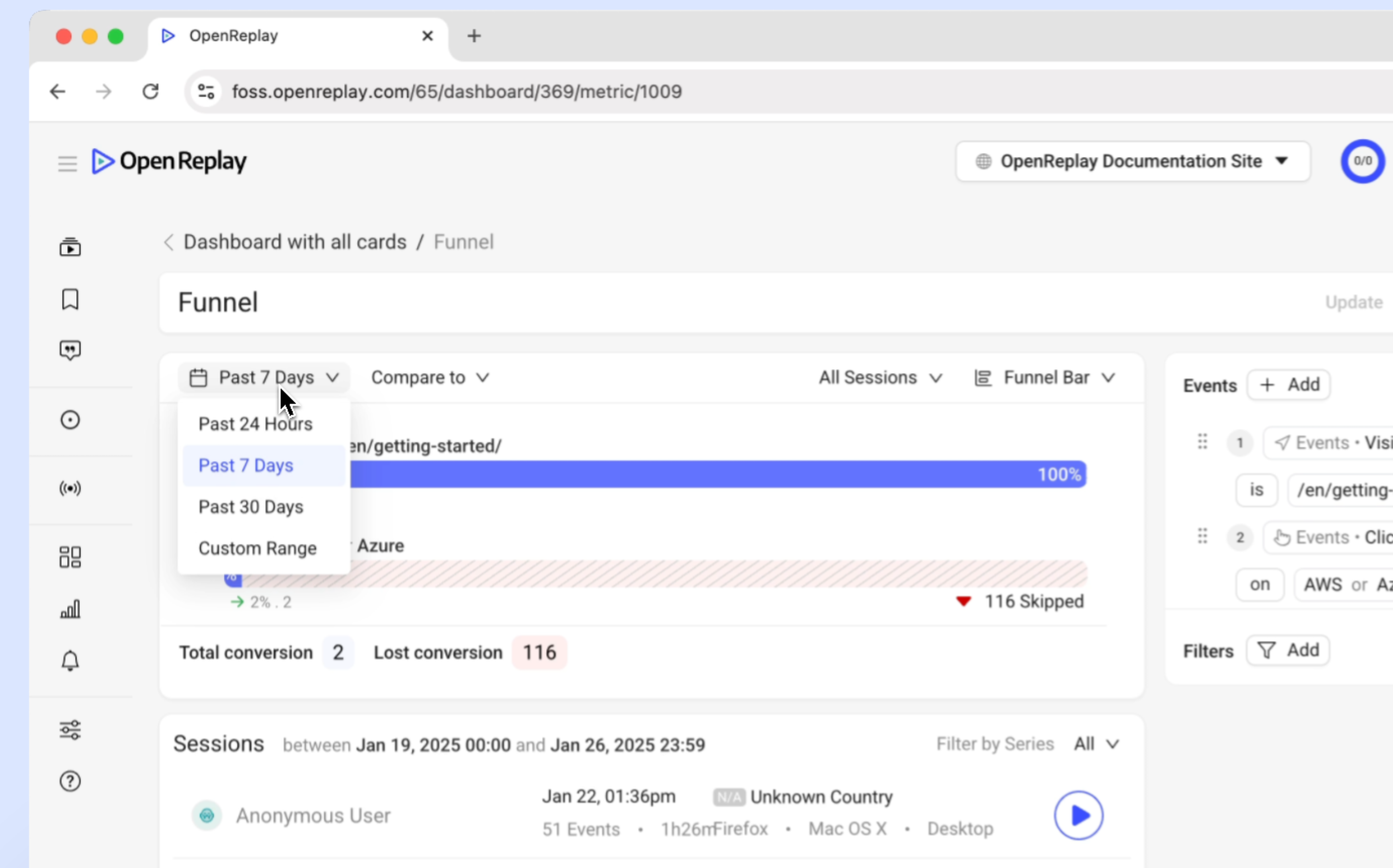 Section titled Interactive features- Session Drill downs: Click on the grayed-out sections in the funnel chart to view sessions of users who dropped off at specific steps. Play session replays to identify issues and uncover root causes of drop-offs.